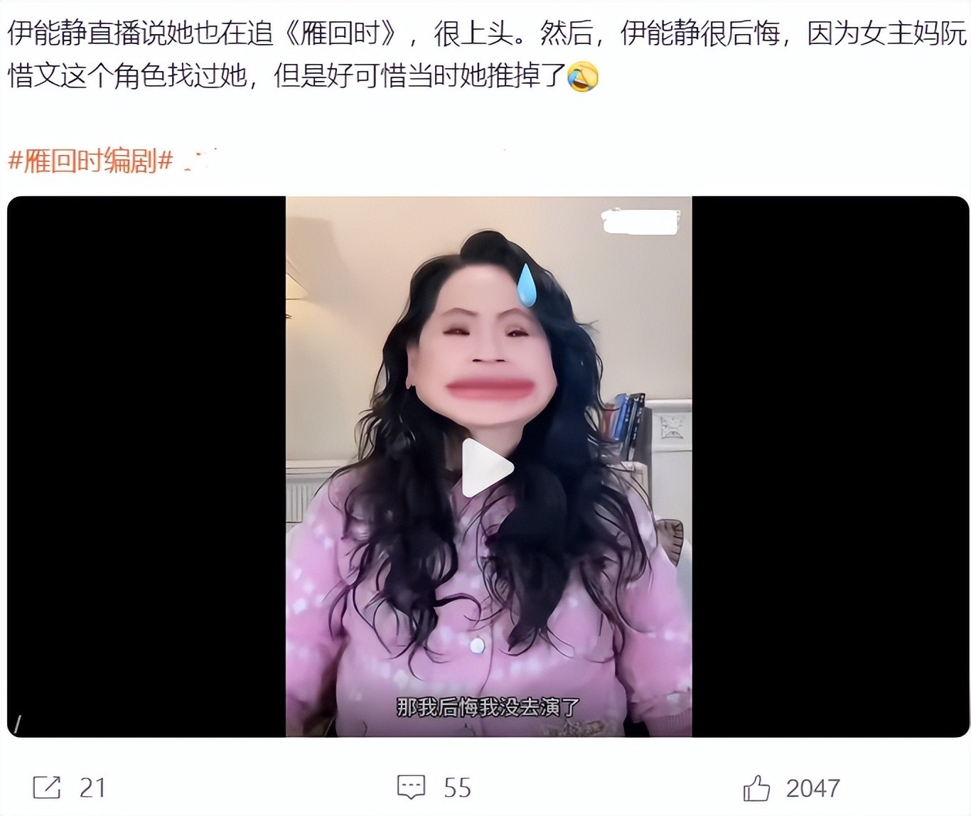 近日,伊能静直播与粉丝互动,表示自己也在追《雁回时》,认为这部剧非常好看,当时伊能静表示:如果庄寒雁的生母找自己演多好,当话音刚落,一旁的工作人员说:“找过你”。